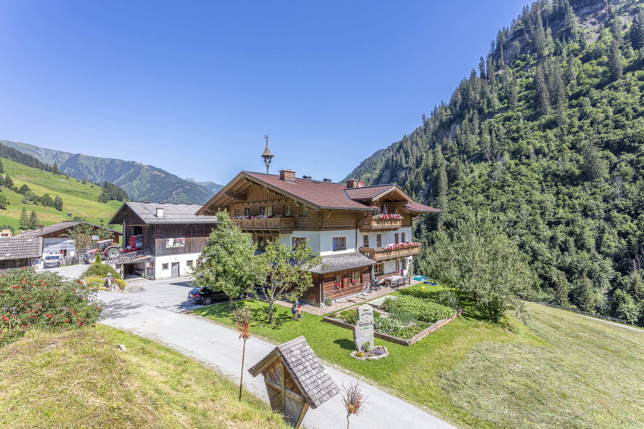 Auf unserer schönen Liegewiese können die Eltern genussvoll entspannen, während sich die Kinder am Spielplatz austoben, im Stall mithelfen oder beim Füttern der vielen tierischen Hofbewohner dabei sind. Am eigenen Fischteich heißt es "Petri Heil", Kufengaudi  verspricht die Rodelbahn hinter dem Haus. Gemütlich wird es bei einer gemeinsamen Wanderung auf eine der 40 bewirtschafteten Almen im Großarltal, und unsere hofeigene Kapelle lädt jederzeit zu einem stillen Gebet.