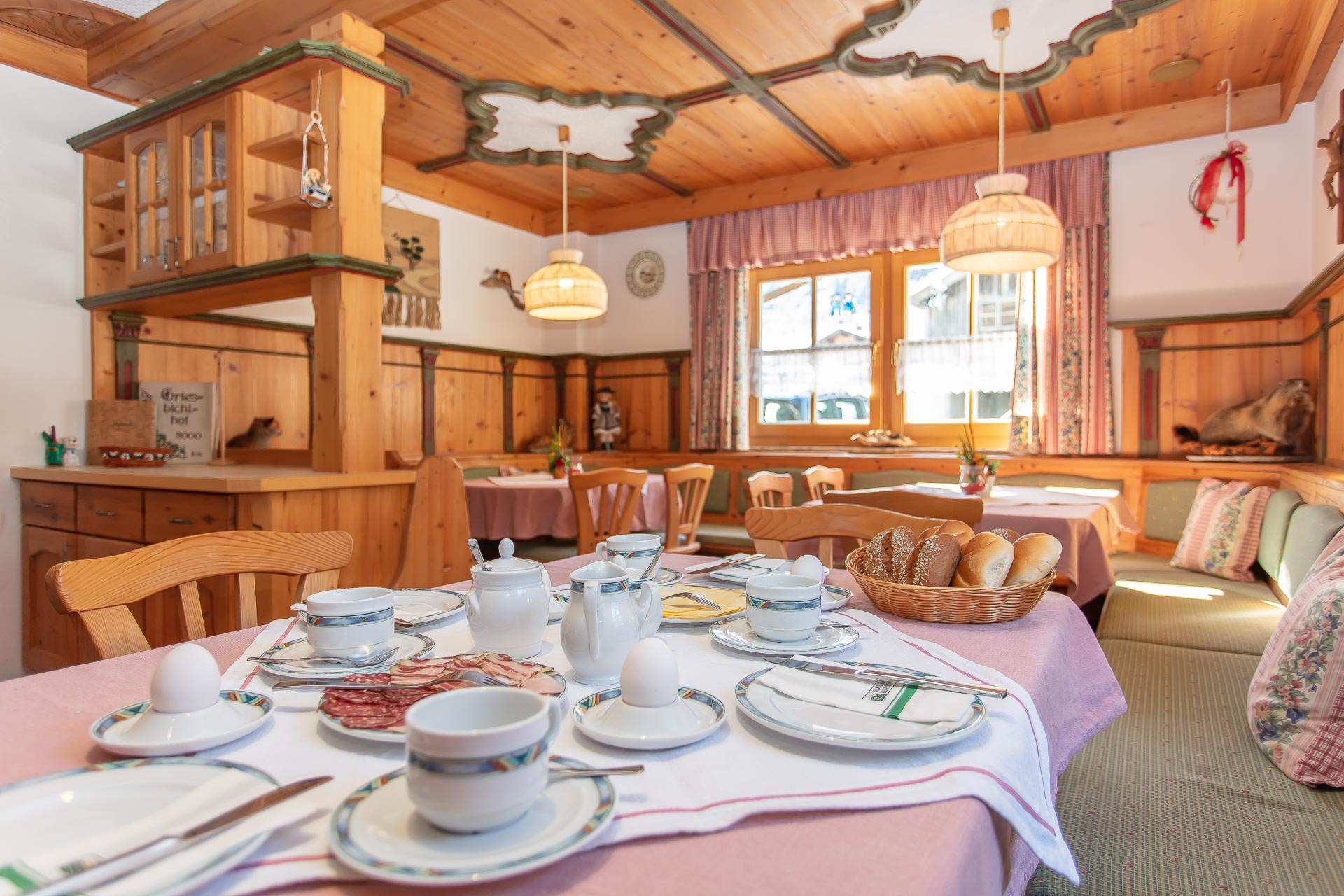 Wer ein Zimmer mit Frühstück in unserem Familienbauernhof Griesbichl in Großarl gebucht hat, für den beginnt der Tag mit einem köstlichen Genießer-Frühstück. Dazu gehört unter anderem frisches Brot und Gebäck, hausgemachte Marmeladen, Honig, diverse Käse- und Wurstspezialitäten, selbstgeräucherter Speck, Eier, Müslis und Säfte.